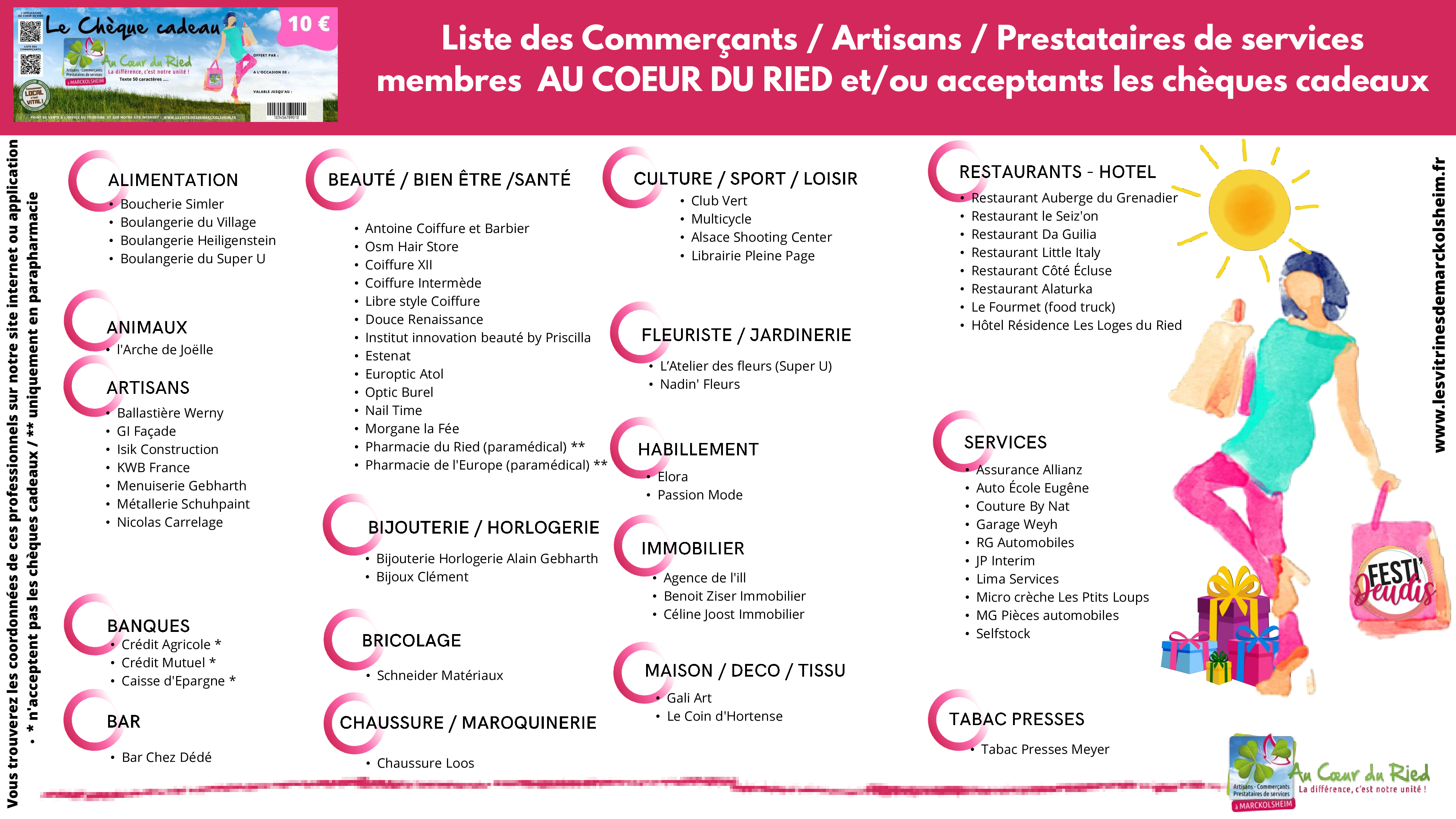 → Les Chèques Cadeaux : une valeur sûre pour faire plaisir autour de vous ! Utilisables dans tous les commerces membres de l'Association AU COEUR DU RIED de Marckolsheim, ils représentent un vrai bénéfice pour l'économie locale.